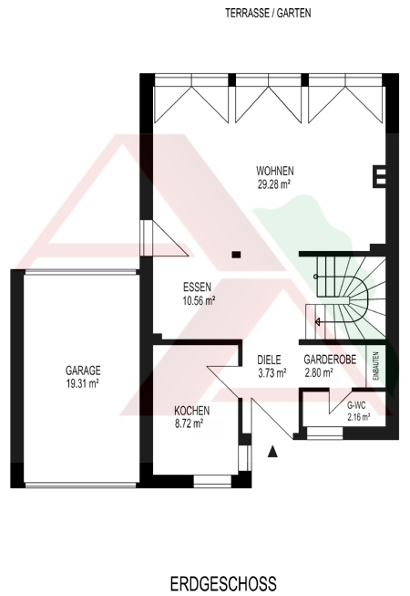 Zum Verkauf steht ein Einfamilienreiheneckhaus in massiver Bauweise aus dem Jahre 1990/91. Das braun-rot verklinkerte Haus ist voll unterkellert und sämtliche Geschossdecken sind aus Stahlbeton. Die Innentreppe vom Keller bis zum Studio ist ebenfalls massiv aus Beton. Das Haus verfügt über vier Zimmer und ein großes Dachstudio mit ca. 3,30 Metern Deckenhöhe in der Spitze. Das Objekt ist äußerst großzügig befenstert, alle Zimmer sind mit Doppeltürelementen versehen, sodass genügend Lichteinfall gewährleistet ist. Die Sanitärräume sind alle weiß gefliest und verteilen sich auf ein Wannenbad en Suite mit Bidet und Fenster, ein innenliegendes Duschbad, ein Gäste-WC mit Fenster sowie eine weitere Dusche im Saunaraum. Direkt links am Haus befindet sich eine Einzelgarage mit Schwingtoren vorne und hinten, dadurch besteht die Möglichkeit auch auf dem inneren Grundstücksbereich zu parken. Der südöstlich ausgerichtete Garten ist pflegeleicht angelegt, gut eingewachsen und bietet auch in den späteren Nachmittagsstunden noch genügend Sonneneinstrahlung.