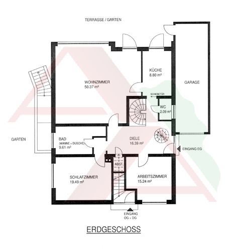 Bei der angebotenen Immobilie handelt es sich um ein freistehendes Zweifamilienhaus mit separaten Eingängen. Das Objekt wurde 1970 von einem Architekten in massiver Bauweise zur Eigennutzung erstellt und 2000 vom jetzigen Eigentümer umfangreich saniert. Der Bau- und Pflegezustand ist ausgezeichnet. Das Haus ist voll unterkellert und verfügt über einen Außenzugang zum Garten. Die jetzige Aufteilung des Hauses beinhaltet eine eigengenutzte Hauptwohnung im Erd- und Dachgeschoss, eine vermietete Wohnung im Dachgeschoss (wird auf Wunsch frei) und einen großen, ausgebauten Spitzboden mit Bad und Küche, der vom Eigentümer als Büro genutzt wird. Die vermietete Wohnung und das Büro sind über einen eigenen Hauseingang erreichbar. Der Garten verfügt über einen kleinen Pool. Am Haupteingang befindet sich eine große Garage mit einem vorgelagerten Stellplatz. Am zweiten Hauseingang ist Platz für 2 weitere Fahrzeuge.